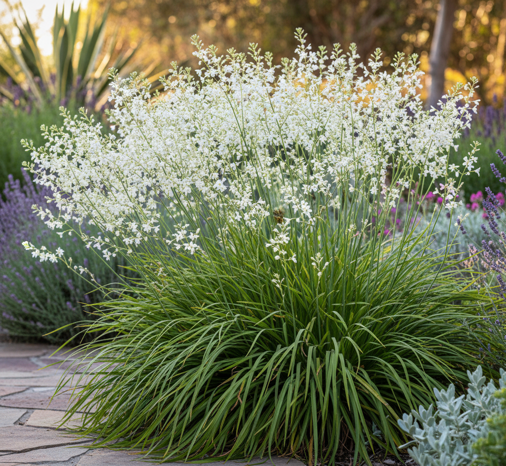 From spring all the way through summer, it sends up tall, airy stems that erupt in a misty cloud of tiny, star-shaped white flowers. The effect is magical—like a haze of “shooting stars” floating above the foliage.